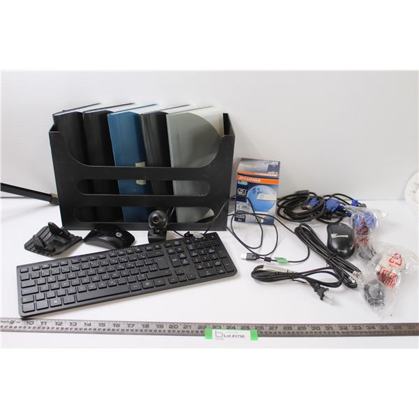 HP Wireless Keyboard & Mouse, Web Cam, Computer Cords, (6) Office Organizers, Blue LED Lightbulb