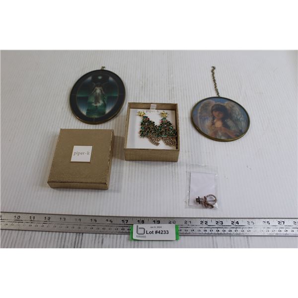 (2) Glass Window Hangings, Christmas Tree Earrings, Snowman Pin