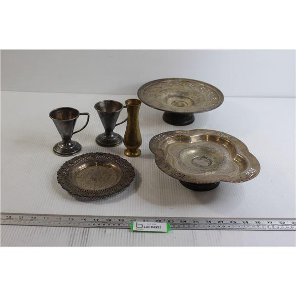 (5) Pieces Assorted Silverplated Dishware, Small Brass Vase