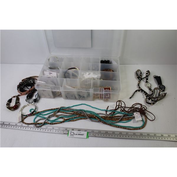 Plastic Case of Assorted Costume Jewelry - Necklaces - Watches - (not running) - Bracelets - Earring