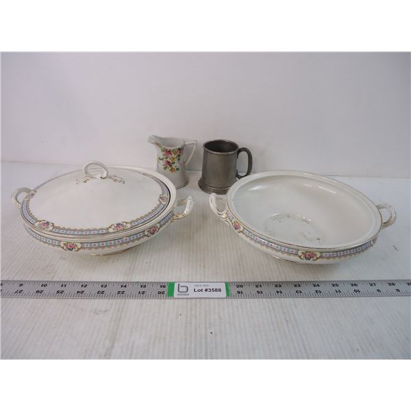 (2) J & G Meakin Tureens (1 missing lid) Creamer and Pewter Mug