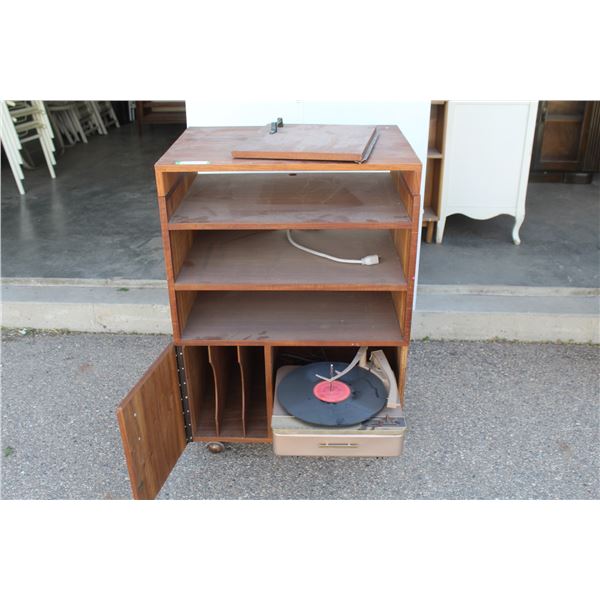 **Wooden Record Cabinet with Turntable on Wheels with Johnny Cash Record - Untested, (1) Door is Not