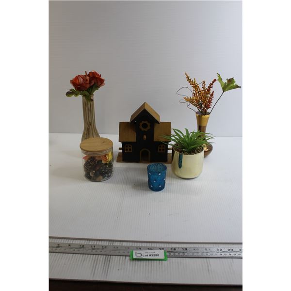 Birdhouse, Jar with Marbles, Artificial Flowers, Misc.