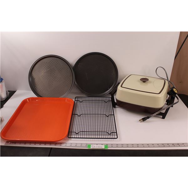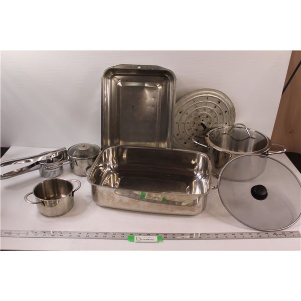 Cookware - Large Pot w/ Lid, Vented Cover, Screen Strainer, (2) Small Pots, Potato Ricer, Pan & Large Roaster (No Lid)
