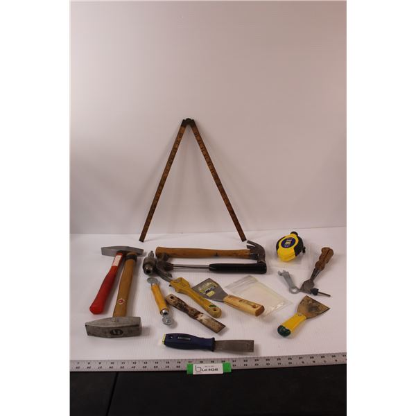 Various Tools of Varying Condition - Hammers, Scrapers, Chisel, Chalk Line, Vintage Folding Meter Stick etc.