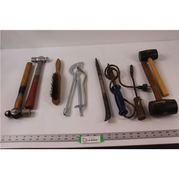 Various Tools of Varying Condition & Age - Ball Peen Hammers, Rubber Mallets, Soldering Irons, Pin Bar, Wire Brush & Drum Brake Tools
