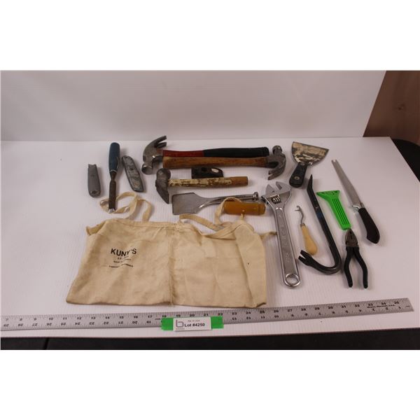 Various Tools of Varying Condition & Age - Claw Hammers, Crescent Wrench, Goose Neck Pry Bar, Chisel, Pliers, Kuny's Tool Pouch etc.