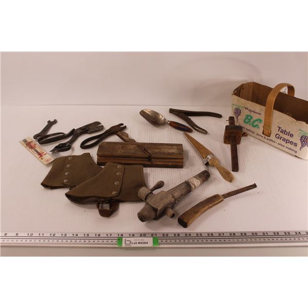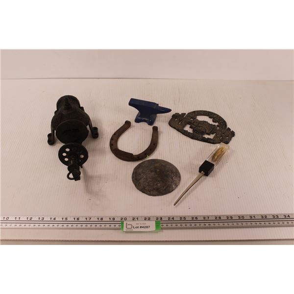 Antique Arcade Crystal Coffee Grinder (Incomplete), Horse Shoe, Mini Record Anvil, Welcome Sign & Wh