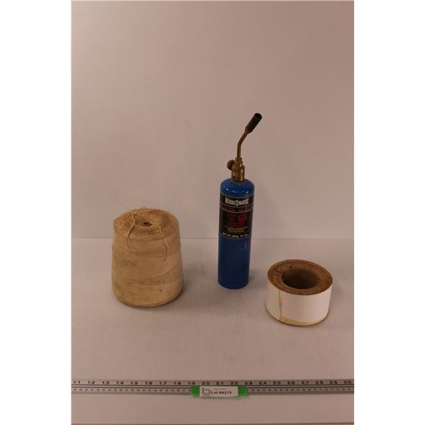 Large Bobbin of String, Bernzomatic Torch (Bottle & Head, Valve Seized) & Partial Roll Vinyl Adhesive Tape 3" Wide