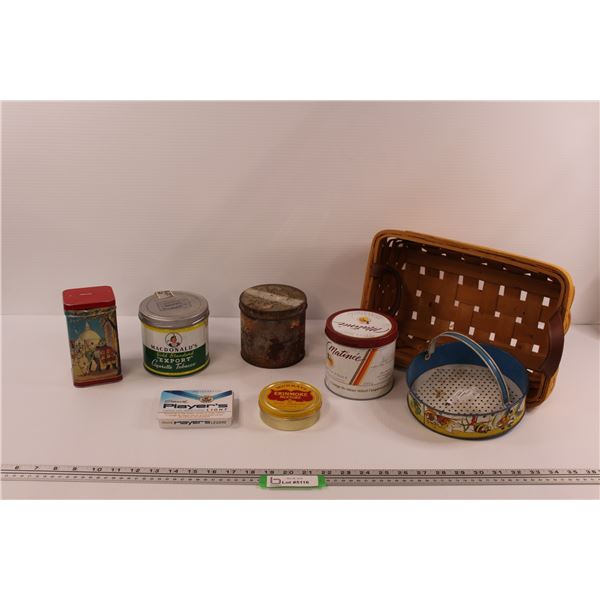 Vintage Tea & Tabacco Tins - Lipton Tea, MacDonalds, Matinee, Players, Murrays, Unknown, Woven Basket & Beach Strainer