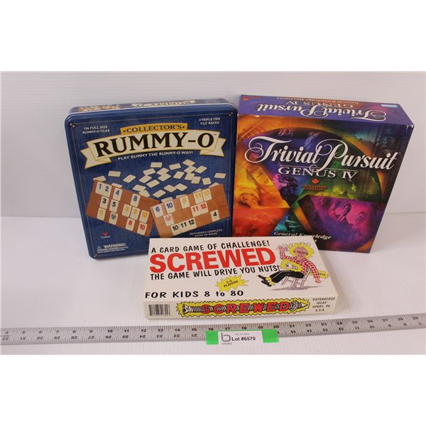 (3) Board Games: Rummy-O, Trivial Pursuit, Screwed - As Is6570 - (3) Board Games: Rummy-O, Trivial Pursuit, Screwed - As Is