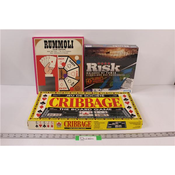 (3) Board Games: Rummoli, Risk(Sealed), Cribbage - As Is