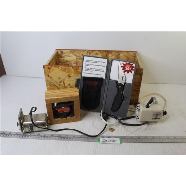 Wooden Box - (2) Sewing Machine Motors (working) - Small Fan (working) - Maximum Knife in Vase