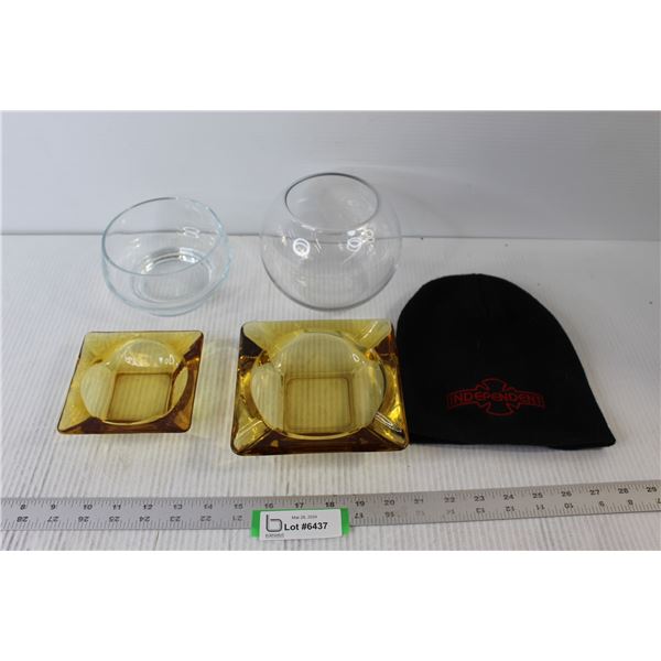(2) Glass Rose Bowls, (2) Ashtrays, Toque