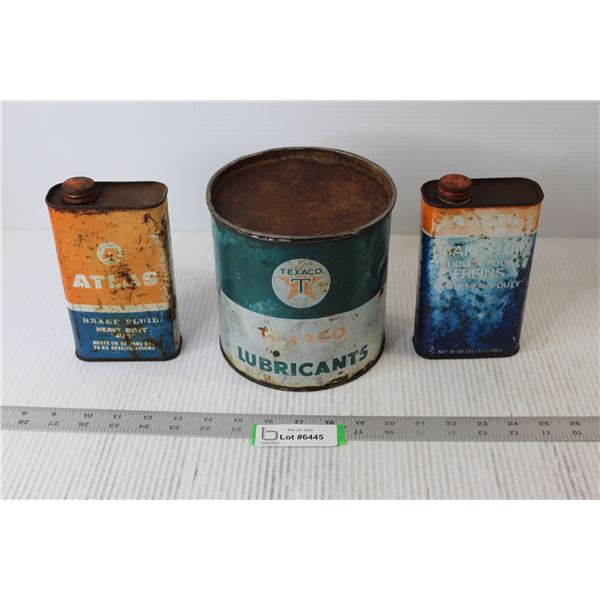 (3) Collector Tins - Two Atlas, One Texaco Lubricant (Partially Full)