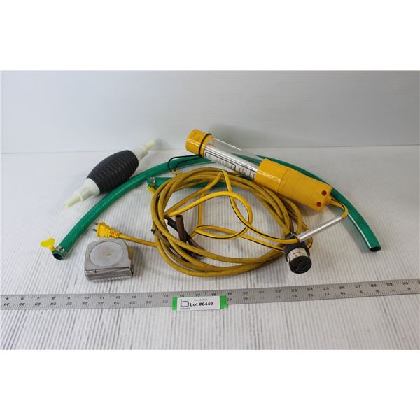 Fluorescent Trouble Light, Siphon Pump & Hose, Tape Measure, Cord