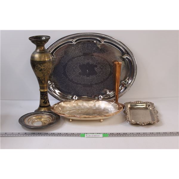 (6) Lot of Metal Serving Trays & Vases: Silver Plate & Copper