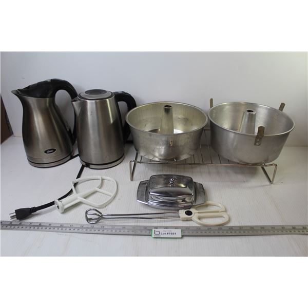 Oster Kettle (powers on) - Salton Kettle (powers on) - (2) Angel Food Cake Pans - Cooling Rack - Metal Butter Dish - Tongs - Mixer Attachment