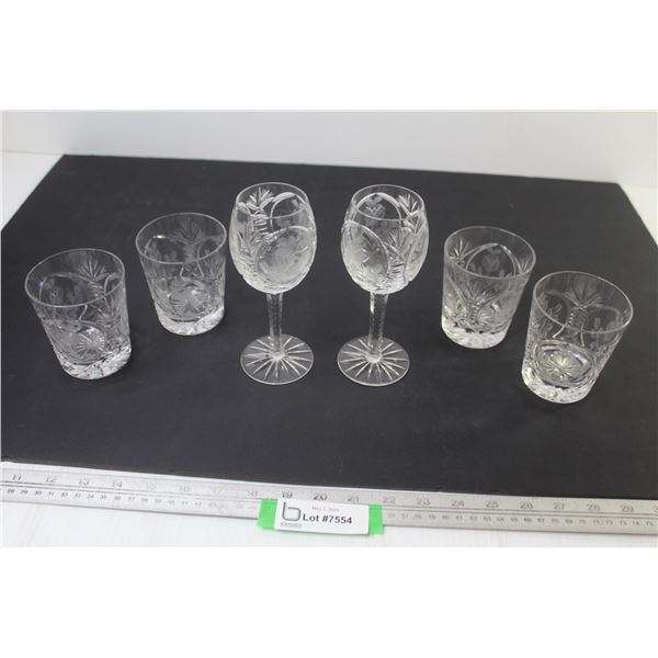 Pinwheel Crystal Vase (rim is chipped) - Zhou Yu-Feng Art Bottle w/Case - Cloth Tasselled Bag - Amber Glass Divided Dish - Flask