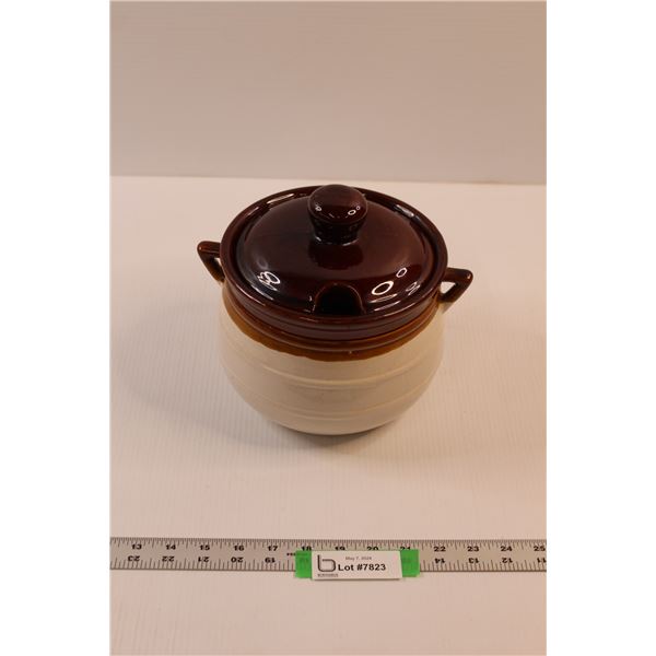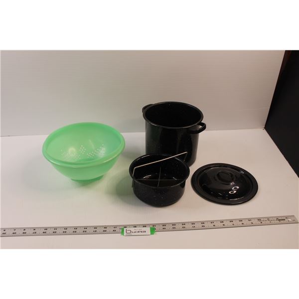 Small Enameled Canning Pot w/Lid And Inserted Handled Strainer/Divider & Tupperware Plastic Strainer