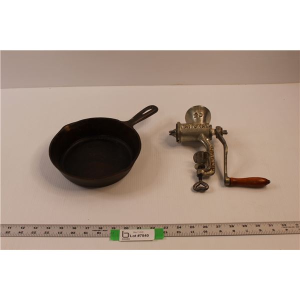 8" Cast Iron Skillet (Made in Taiwan) & Vintage Sponge National 20 Table Clamp Manual Meat Grinder
