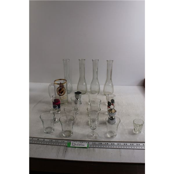 (4) Vases, Glass Stein, Assorted Shot Glasses/Mini Glasses