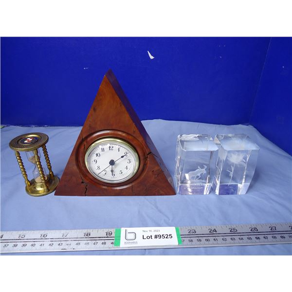 (2) 3-D Etched Glass Paperweights, Clock, and Small Hourglass