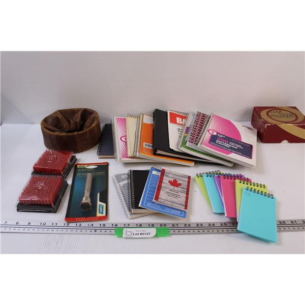 Lot: Leather Solid Bottom Satchel, Various Notebooks, RV Water Heater 4.5" Anode Rod, (2) Bristle Bo
