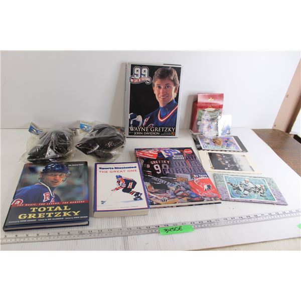(2) Wayne Gretzky 1995 Street Attack Roller Hockey Elbow Pads in Original Package, 1997 Hallmark Christmas Ornament, (4) Collectible Books