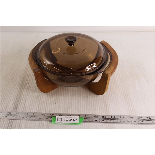 Mid-Century Pyrex Round Casserole Dish w/ Wood Holder