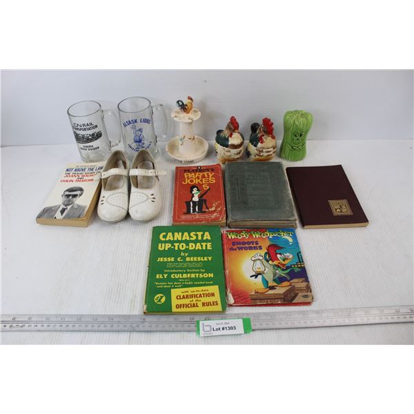 (6) Various Books, Playboys Party Jokes, <Misc. (2) Glasses CN Rail, Misc., Salt And Pepper Shakers, Misc.