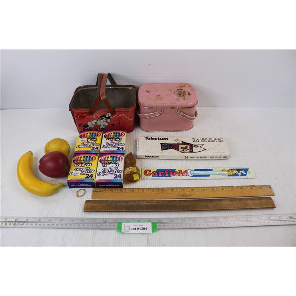 (2) Vintage Lunch Pails, (4) Boxes Of Crayons, (3) Rulers, Misc.