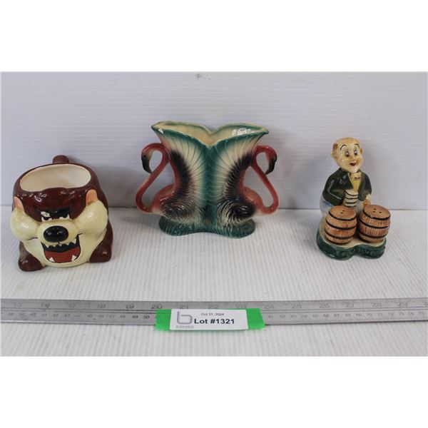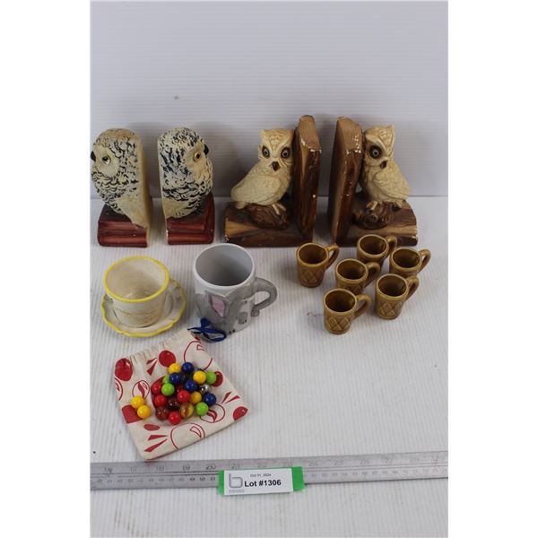 Bag Of Vintage Marbles, (2) Sets Of Owl Book Ends, Cups, Misc.