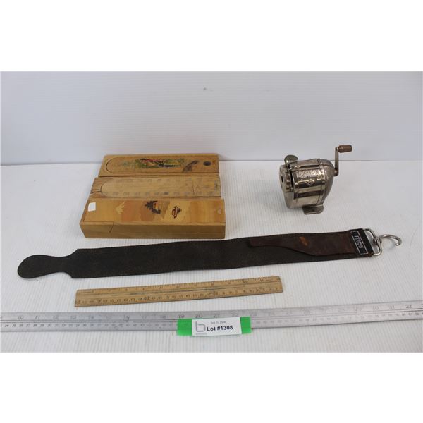 (3) Vintage Wooden Pencil Boxes, Leather Razor Strop, Ruler, Misc.