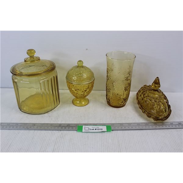 (4) Yellow Amber Glass Items - Depression Glass Cookie Jar, Egg Shaped Trinket Jar, Vase, and Depres