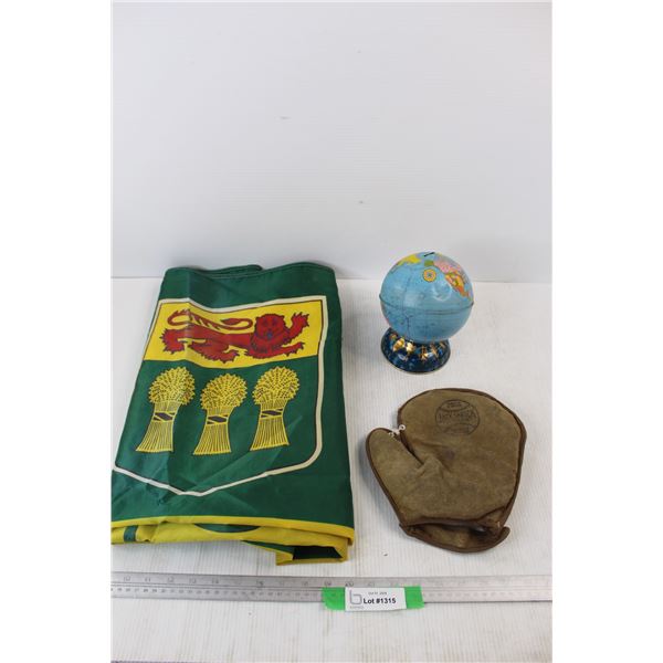 Saskatchewan Flag- 72'' x 36'', World Globe Piggy Bank, Vintage Very Old Jack Canuck Junior Baseball Glove
