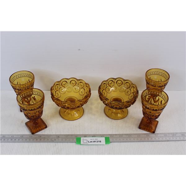 (4) Vintage Amber Glass Divided Dishes and Bowls - (2) Iridescent