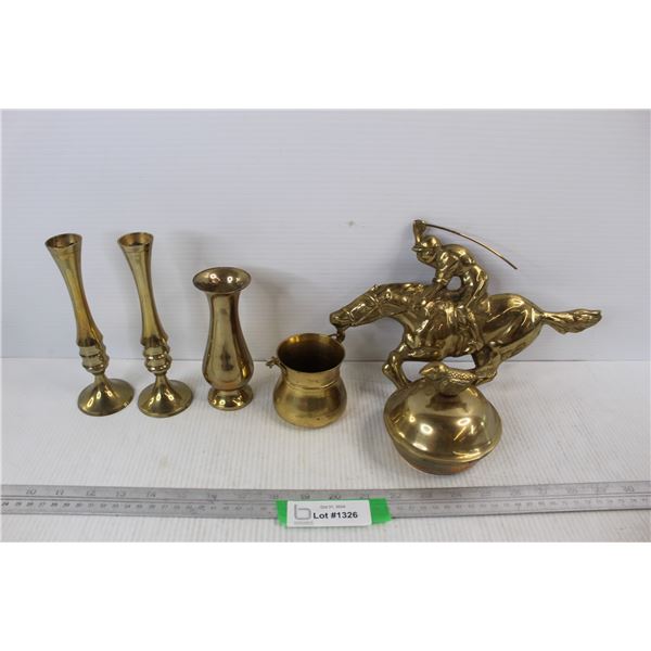 (6) Various Brass Items, Vases, Jockey On Horse, Misc.