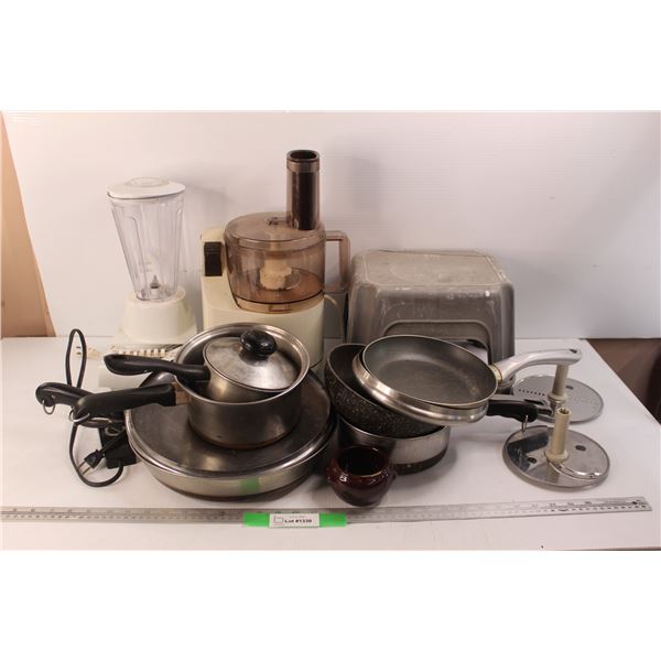 *(2) Rubbermaid Plastic Stools, Misc. Pots And Pans, (2) Blenders/ Food Processers, Instablend, Misc. - Both Power On