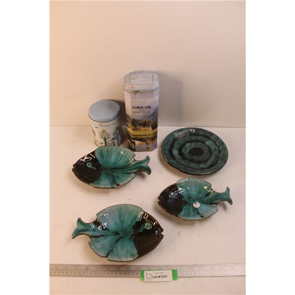 (4) Blue Mountain Style Decorative Plates, (3) Are Fish Like, (2) Collectors/ Decor Tins