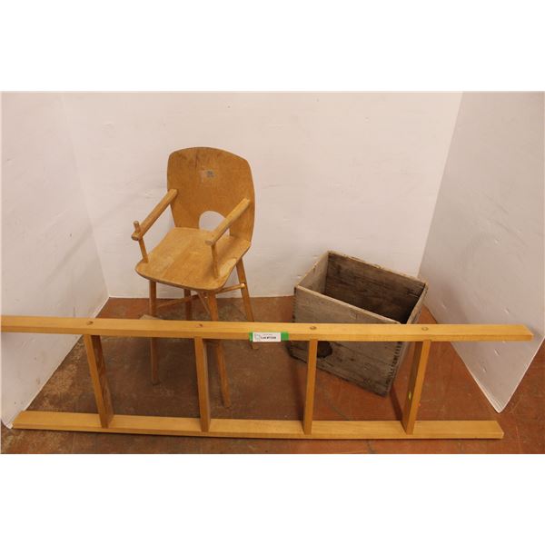 *High Chair (Wood - Cracked) 26.5" Tall x 10" x 10" , Ladder (Wood) 54" x 13.25", Wood Crate 12" Tal