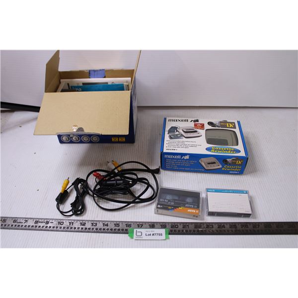 Maxwell Cassette Rewinder and Box of Cords and Tapes