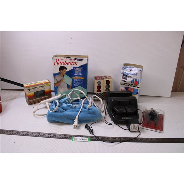 Supercharger, Chess Pieces, Gloves, Sunbeam Heating Pad and Battery Monitor