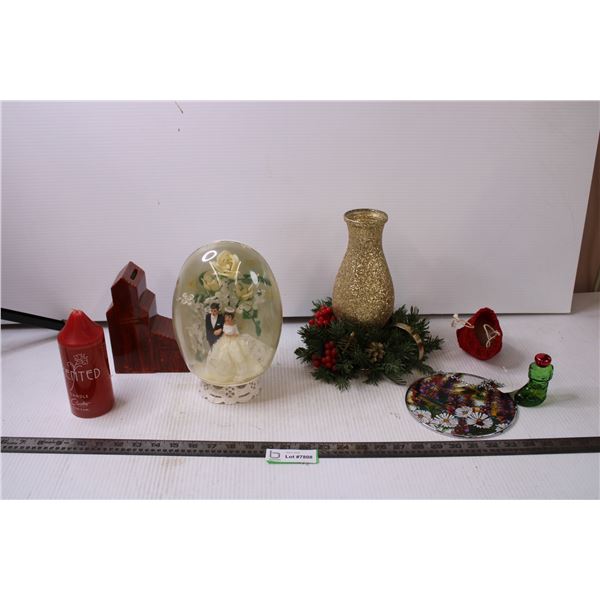 Vintage Wedding Cake Topper, Christmas Centrepiece, Moose Jaw Coin Bank and Misc.