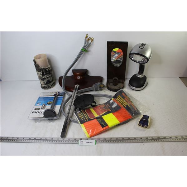Wooden Mirrored Candle Holder - Flashlight - Body Glove Vest - Candle - Wireless Desk-top Antenna - Misc. Items