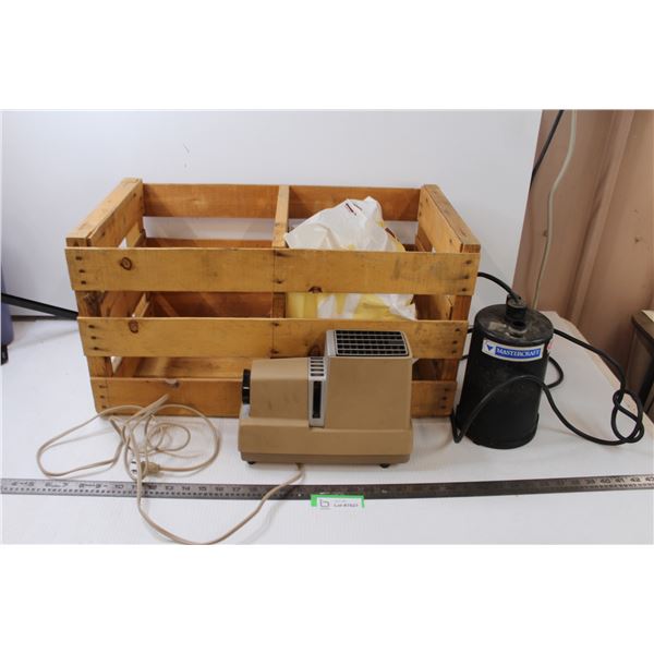 * Vintage Projector, Mastercraft Sump Pump, Wooden Crate