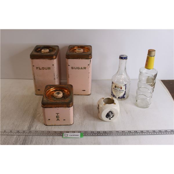 Card Suites Candle Holder, (2) Empty Liquor Bottles, Flour, Sugar, and Tea Containers