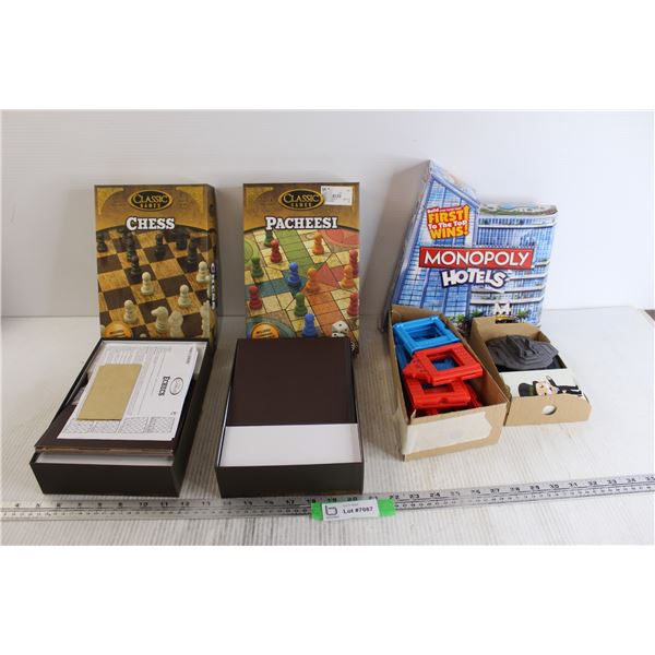 (3) Board Games - Chess, Pacheeso, Monopoly Hotels - All As Is