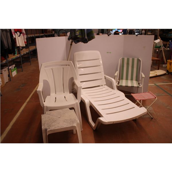*(3) Lawn Chairs and (2) Foot Stools +Umbrella and Stand