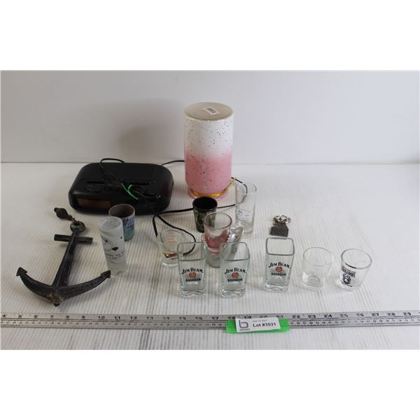 (11) Shot Glasses - Shark, Polar Bear, Harambe; Alarm Clock - Untested; Misc.